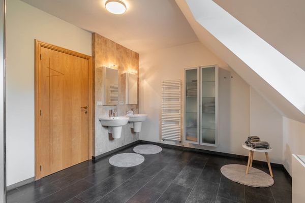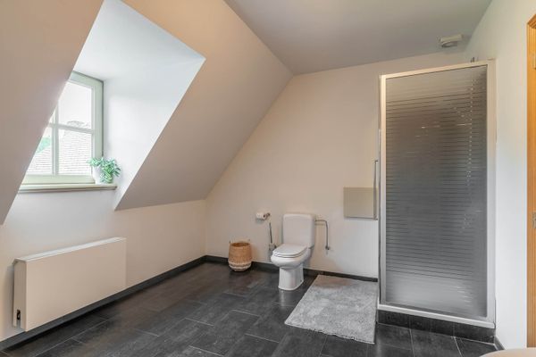 Op de eerste verdieping komen we terecht op de overloop, die via de nachthal toegang geeft tot 3 zeer ruime slaapkamers en een ruime badkamer. Ook is er nog een extra zolderruimte van 40m2.