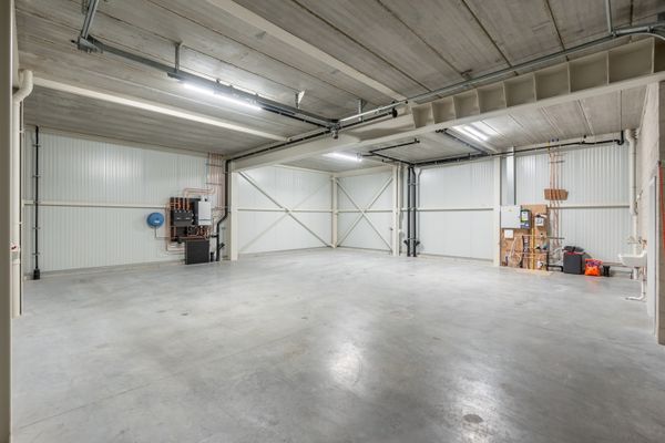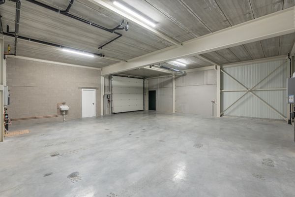 De gelijkvloerse bedrijfsruimte is uitgerust met een sectionale poort voor een eenvoudige toegang voor verschillende types van voertuigen en een gepolierde industriële betonvloer.