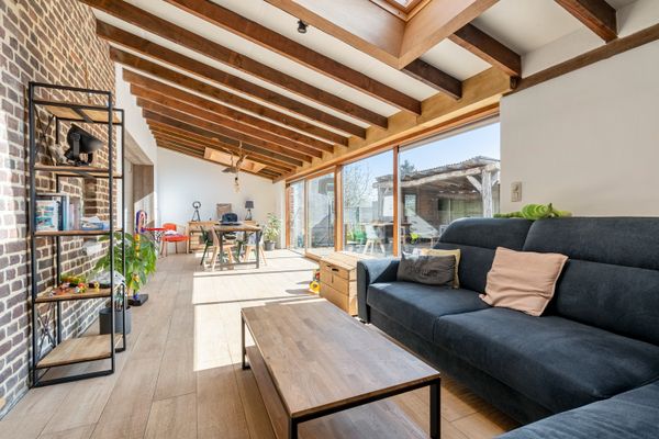 Dès l'entrée, vous êtes accueillis dans le hall d'entrée qui mène à la cuisine spacieuse, propice aux moments conviviaux en famille. A côté, vous trouverez un salon et une salle à manger lumineux avec une véranda attenante.