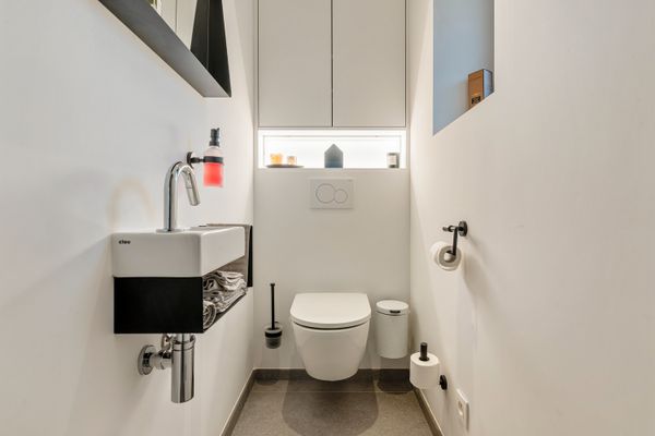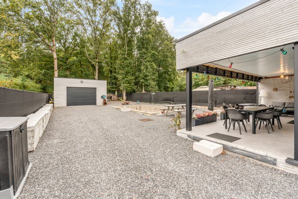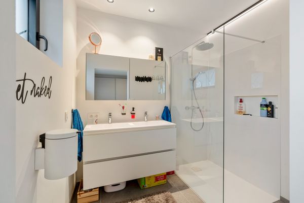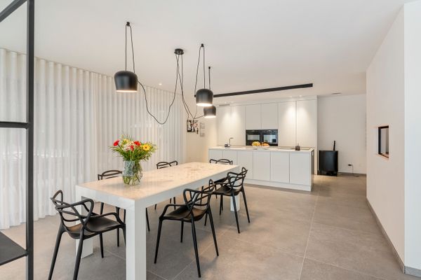 Op het gelijkvloers vinden we een lichte leefruimte met open keuken, aansluitend op een overdekt terras.