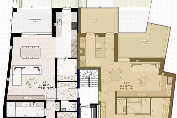 2.1 heeft 2 slaapkamers en een oppervlakte van 98m², terras 10m²