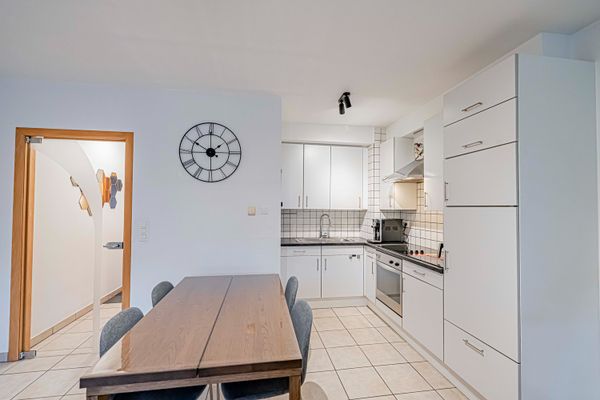 Aansluitend aan de woonkamer bevindt zich de moderne, volledig uitgeruste keuken met kwalitatieve toestellen zoals een kookplaat, oven, vaatwasser en een koelkast met diepvriesvak. De frisse uitstraling van de keuken maakt dat ze past bij elke interieurstijl.