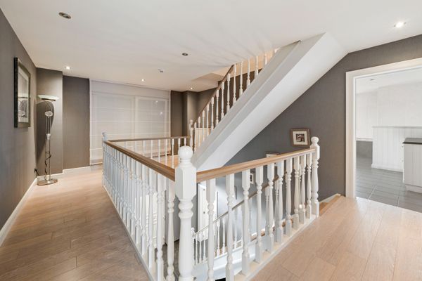 Bij het betreden van de woning wordt u verwelkomd in een royale inkomhal met een prachtige vide die doorloopt naar de twee bovenliggende verdiepingen, wat zorgt voor een uniek gevoel van ruimte en licht. Op het gelijkvloers bevinden zich eveneens een bureauruimte en twee aparte toiletten.